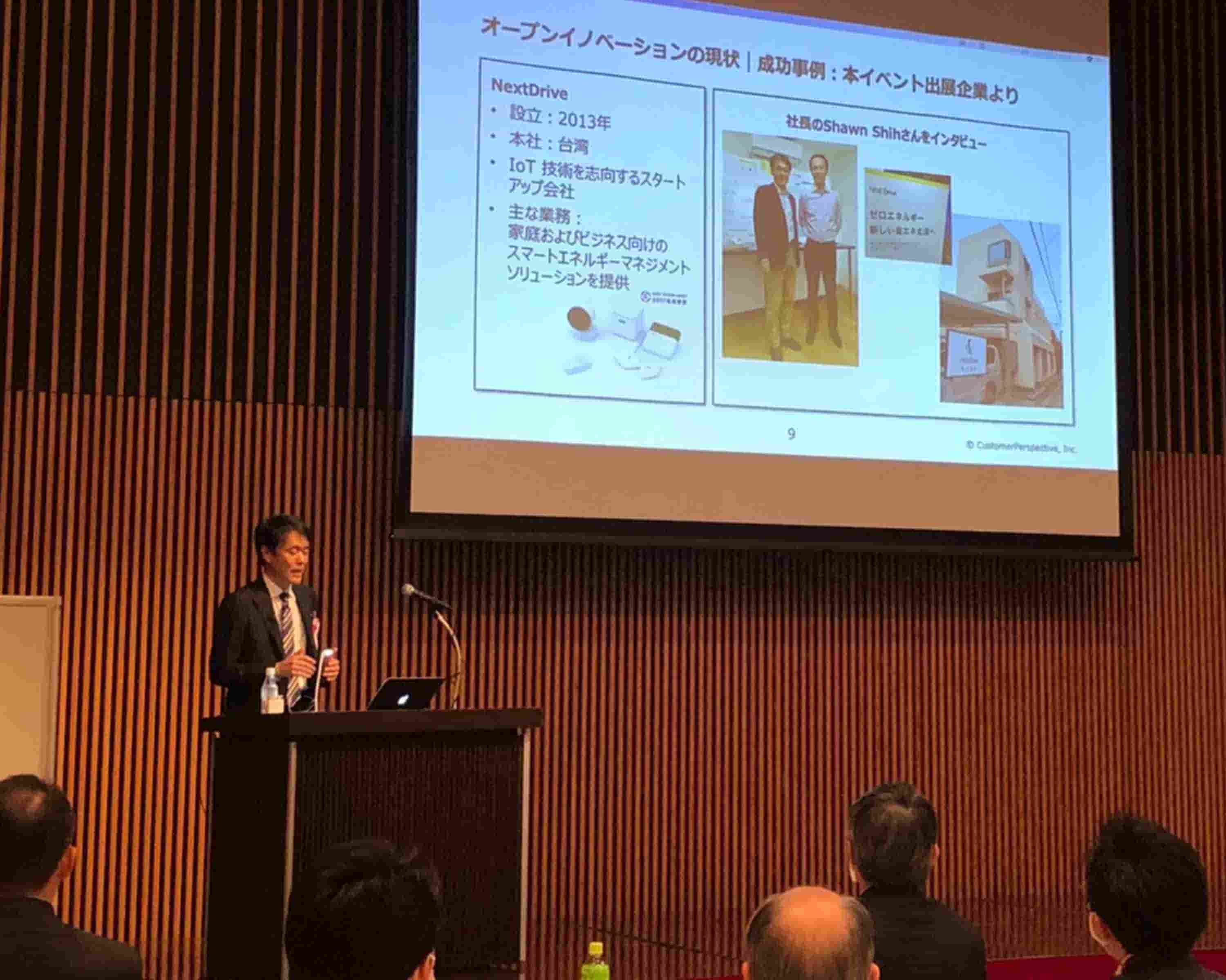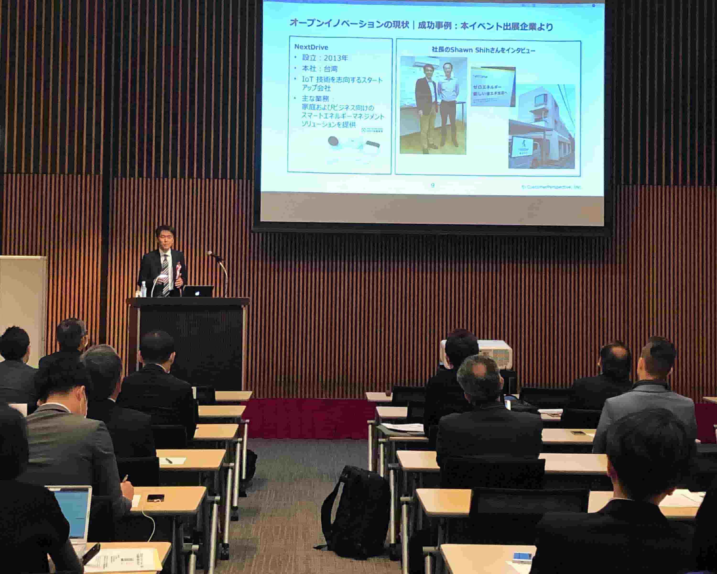 参加企業はスタートアップ中心の外国企業と国内の中小企業。外国企業はAI、ロボティクス、IoTなどの分野で技術やノウハウを持ち、各社ユニークなサービスを提供しています。私の講演は「組織内部でのイノベーションを加速し、外部でのイノベーションの活用を広げるため、意図的に知識の流入・流出をすすめる」というオープンイノベーションの考え方を紹介。イベント参加企業NextDrive社の成功事例、AWSやAlexaをはじめとするAmazonのモデルの分析、参加企業の事前調査や会場でのアンケートをおりまぜ、インタラクティブなプレゼンテーションとなりました。参加企業の一社、Magencyのご協力もいただき、Sparkupというリアルタイムコミュニケーションツールを活用させていただきました。